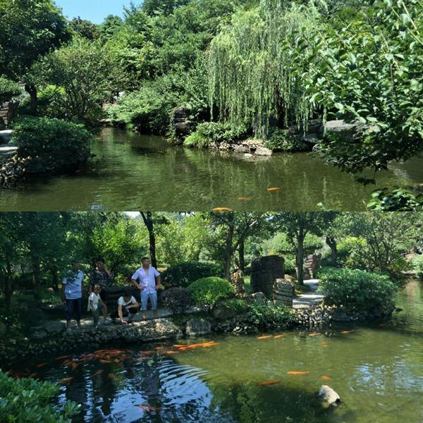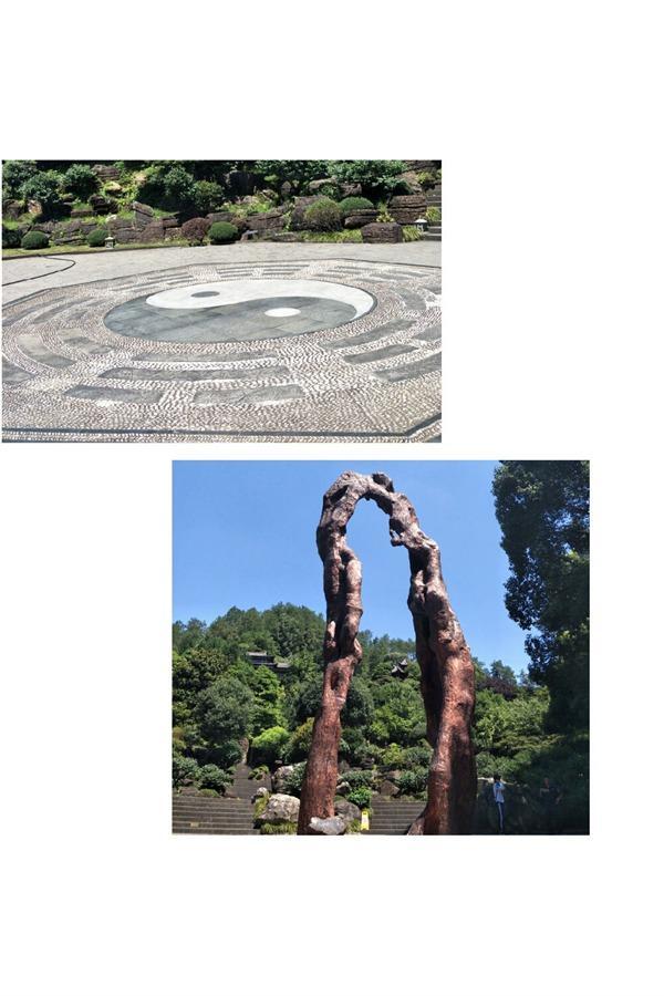 欣賞完八卦圖及福門祥光后向右轉,漫步在石階上,一縷縷金黃色的陽光從密密層層的枝葉間投射下來,地上印滿了大大小小的粼粼光斑,美麗極了。園內每個景點都有指示牌,還有保安和服務人員的溫馨提示,所以根本不用擔心迷路。