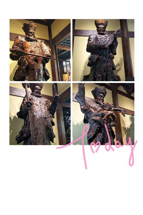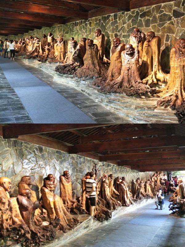 我特別喜歡五百羅漢長廊圍繞著大雄寶殿兩側的設計,寓意著“輪回”、“回歸”的含義。以根塑型,講根雕藝術和佛教文化珠聯璧合,傳統雕刻技法與現代根藝融匯創新,全長620余米,羅漢姿態各異,風格獨特,氣勢恢宏,堪稱大型根雕羅漢主題造像的世界之最,同時也成就了根雕五百羅漢的開化“道場”。