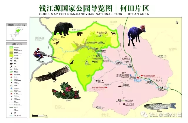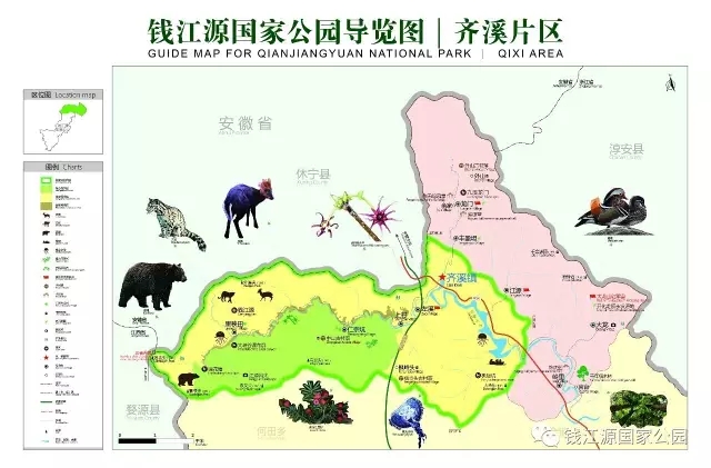 錢江源國家公園(齊溪片區)位于浙、皖、贛三省交界處,與安徽省休寧縣嶺南省級自然保護區毗鄰。地處錢江源國家公園北部,是錢塘江的發源地,轄里秧田、仁宗坑、上村、左溪、齊溪等5個行政村,11個自然村。錢江源頭自然生態環境獨特,素有“中國的亞馬遜雨林”之稱,森林覆蓋率97%以上,分布著錢江源頭、蓮花塘、蓮花溪、天子湖、九曲灘、楓樓坑、大峽谷、中山古村落、楓嶺頭古村落等游憩點及人文景觀40余處。其中有國家I級重點保護野生植物南方紅豆杉、銀杏2種,國家Ⅱ級重點保護野生植物連香樹、長柄雙花木等21種。特別是長柄雙花木群落之大,分布之集中,在全國罕見。有國家I級保護動物白頸長尾雉、黑麂、云豹、豹等4種,是兩種國家一級重點保護動物黑麂、白頸長尾雉的主要分布中心。