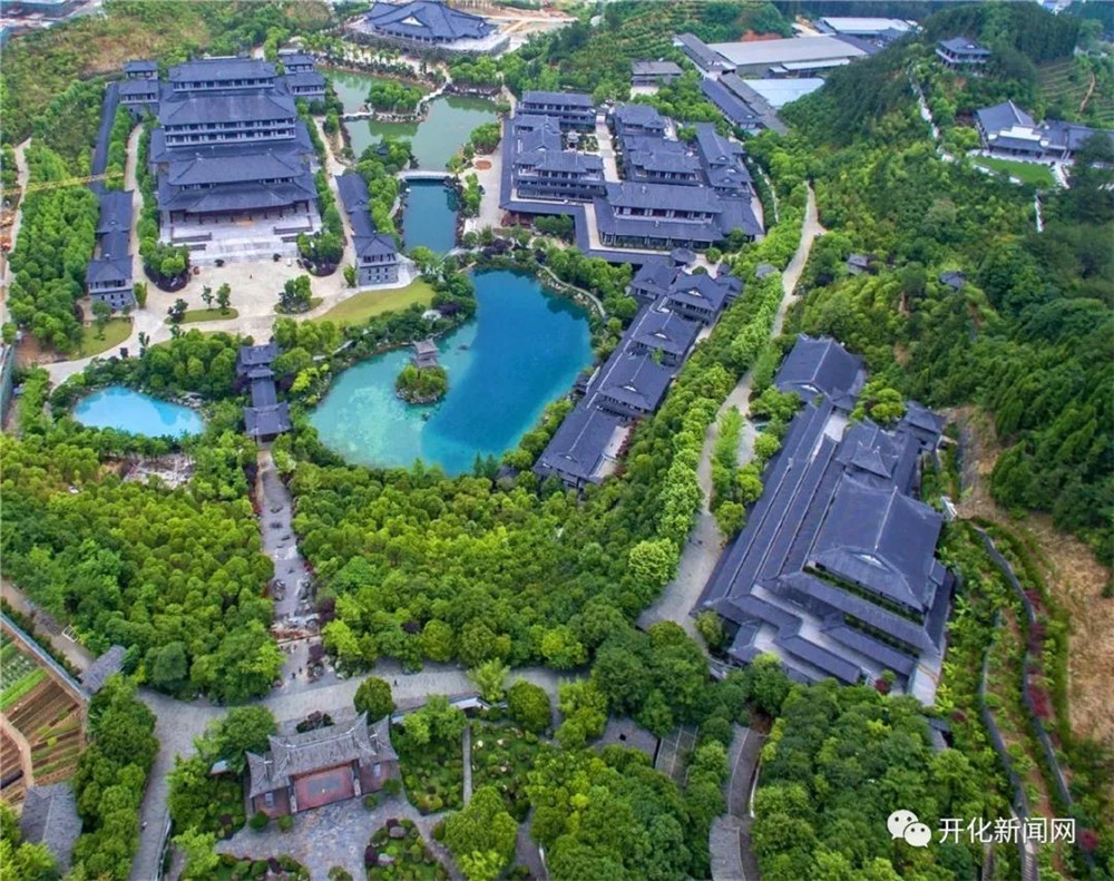 在開化縣根宮佛國三期——華夏根文化景區的長階上,能看見兩處顏色特別的水域。以佛國廊橋為界,西側是一個藍如寶石的圓形“湖泊”,東側的水域則碧如翡翠,兩片水域高低相連,呈現出顏色由藍變綠的奇觀。