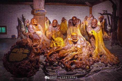 這里可以說是以根雕藝術展現佛教文化的圣地,千年樹神匯聚的藝術殿堂,這規模不大的三座大殿里分布了無數的佛像雕塑,諸如釋迦牟尼、未來佛、四大菩薩、四大天王、五百羅漢等佛教文化系列巨型根雕作品一千余件。