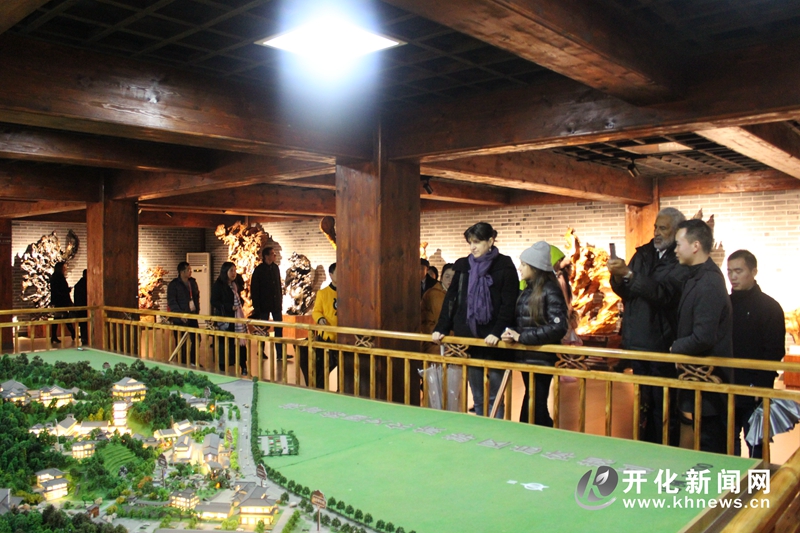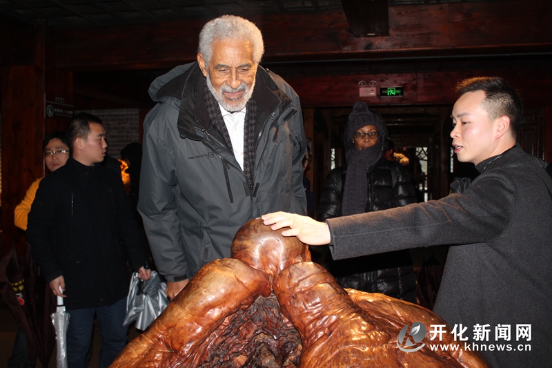 從十二生肖根藝作品長廊到天工博物館,大使一行聽著導游們的講解,細心感受著根雕藝術的魅力?!鞍凸R的根雕比較少,開化的根雕不僅很雄偉,而且細節處理地非常到位?!卑凸R駐華大使羅伯特·斯特林·羅伊·匡特一邊撫摸著根雕作品一邊笑著相告?!斑@真的是太美了,這些根雕作品非常有意思,感覺十分宏偉壯觀!”來自塔吉克斯坦大使特別代表庫爾班諾夫笑o法佳利同樣表示驚嘆之情。面對氣勢恢宏的巨型五百羅漢根雕系列,大使一行無不嘖嘖稱奇,一路上紛紛拿起相機拍照留念??肆_地亞駐華使館文化參贊碧塞拉·法布里歐告訴記者:“之前沒有見過根雕,開化的根雕真的是太震撼了!而且每件作品都有自己的特點,令人著迷!”同時,作為一名文化參贊,她希望在未來能有機會將本國的石頭雕刻與開化根雕進行文化交流。