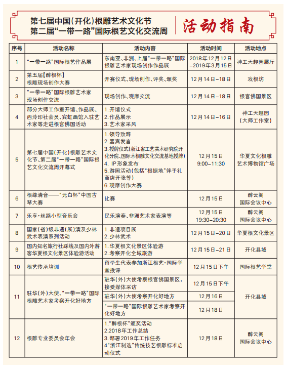第七屆中國(開化)根雕藝術文化節的整個節慶活動主要圍繞根雕文化創作與交流、第二屆“一帶一路”國際根藝文化交流及華夏根文化景區游園體驗游展開。
