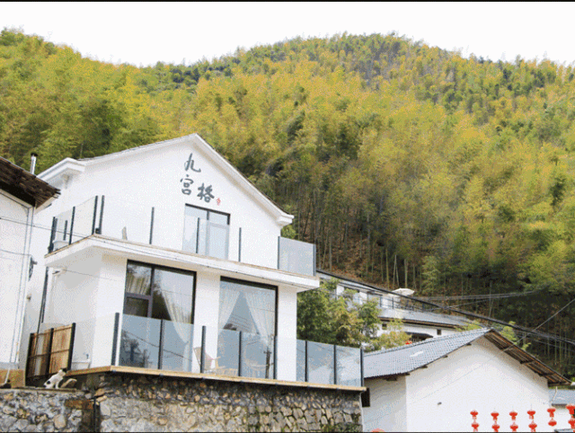 驅車沿著蜿蜒的萬塢線一路向北,到了路的盡頭,一小片白墻黑瓦的建筑在綠樹的環抱中格外顯眼,一扇扇大大的落地的窗戶更是與周圍的民房區別開來,這里便是民宿——九宮格。下了車,便能聽到耳邊潺潺的流水聲和竹林隨風搖曳發出的沙沙聲。這里的民宿都是整棟租給游客的。