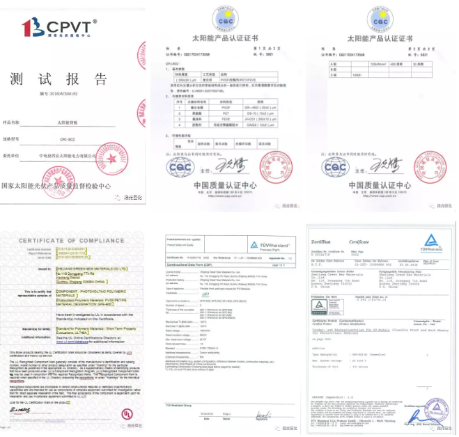 歌瑞公司自2010年成立以來,始終致力于以技術創新推動行業發展,是國內首家真正實現背板材料完全國產化的企業。2017年,采用歌瑞公司GPG背板制作的組件,在無錫國家光伏測試中心完成了DH3000小時和UV90+TC200+HF20的序列老化超級耐候測試,組件衰減功率僅為0.9%和2.55%,并達到了UL1703的防火等級測試ClassA級,實現了耐候性能與安全性能的完美結合。公司主打產品——氟合金膜與太陽能背板產品,已獲得多家國內外權威第三方認證證書,取得了進入國內國際高端市場的通行證。其中GR系列氟合金膜獲得美國UL黃卡證書、GP系列背板獲得德國TUV萊茵的認證證書和中國質量認證中心CQC證書。