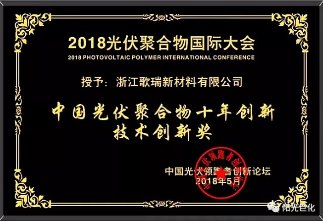 歌瑞公司于2013年被認定為“國家高新技術企業”,于2017年榮獲“國家知識產權優勢企業”等,這次榮獲“中國光伏聚合物十年創新技術創新獎”,既是業界對歌瑞公司的高度認可,同時也再度證明了該公司堅持自主研發、自主創新的價值所在。