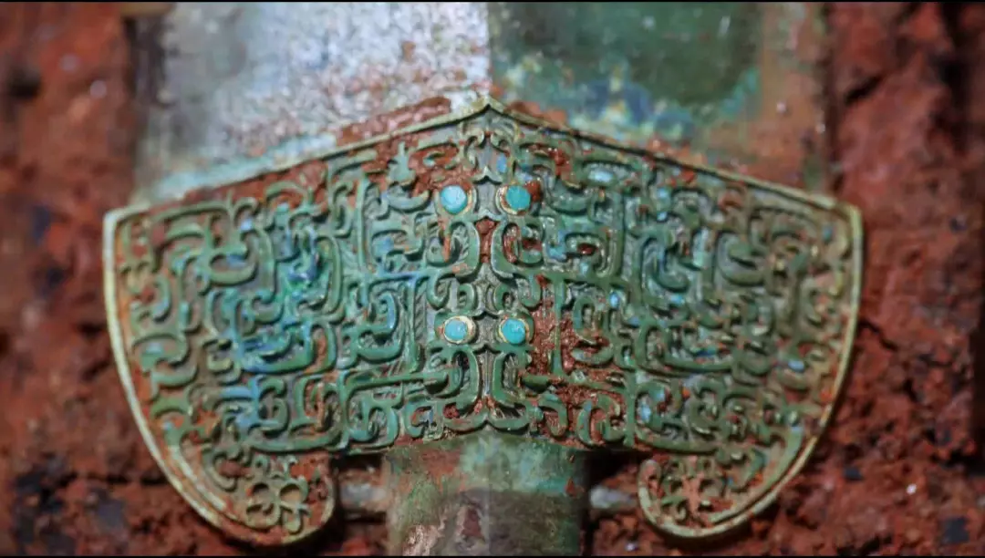 劍格(劍身與劍柄之間作為護手的部分)的紋飾鑄造水平非常高,表面還裝飾著四顆通透的綠松石。
