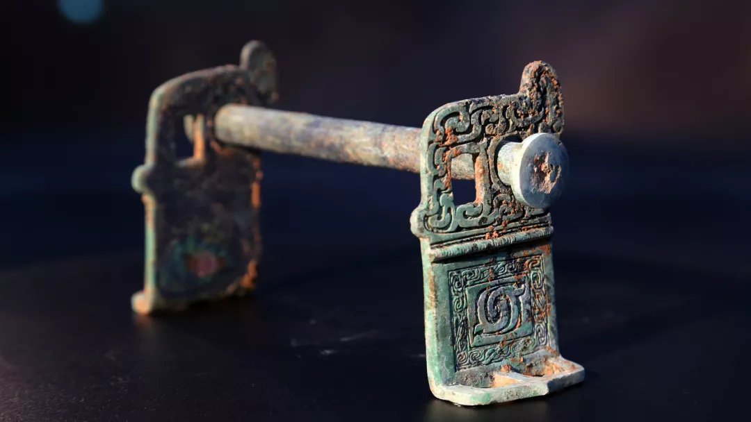 與渾圓箭鏃形成鮮明對比的青銅短劍,劍身厚重、兩刃鋒利,應該是一把實用兵器。兩千多年的掩埋,也未能抹去劍刃的寒氣。
