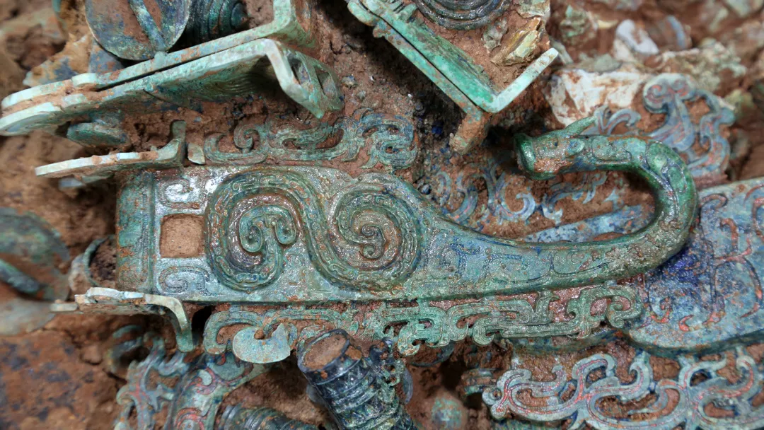 龍頭引頸、翹吻、張鼻,外凸的雙眼仿佛充滿憤懣與狂傲,精致的紋飾里還填著紅色的朱砂。想象一下,青銅器在沒氧化前呈金黃色,黃金器身、赤紅紋飾,安裝在戰車上的承弓器會是何等威武。