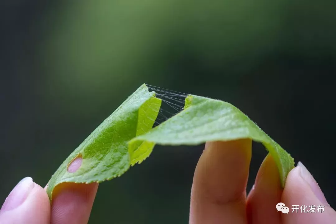 ▲杜仲葉片的膠絲 蔣天沐/攝