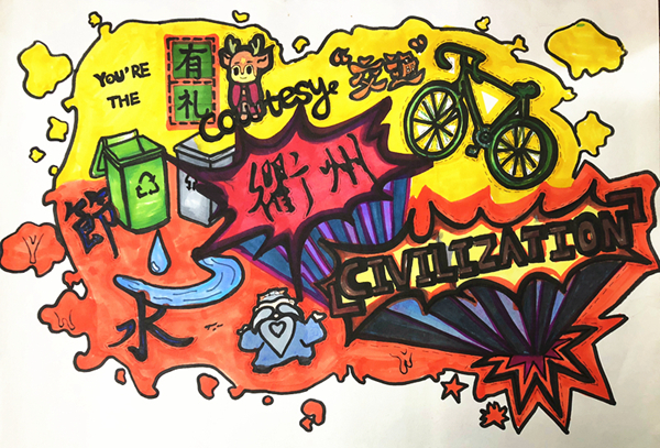 2、設計了“節約水資源”、“文明交通”等名稱,中英結合,體現“四德”其中的垃圾桶元素表示要注意垃圾分類,體現了保護環境,更加體現一座最有禮的城市。(趙鑫)