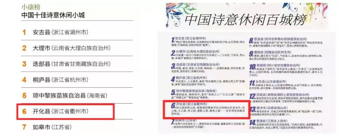 近日,《小康》雜志社聯合國家信息中心,并會同有關專家及機構,對“2019中國休閑小康指數”進行了調查。調查揭曉了“中國詩意休閑百城榜”,在入選的100座小城中,開化縣在“中國十佳詩意休閑小城榜”上排名第六,在“中國詩意休閑百城榜”上居第6位。