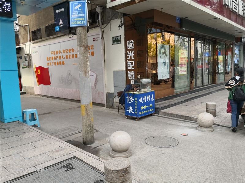 在南街和裱背巷口,一流動修表鋪擺放在巷口,修表人正埋頭忙碌著。