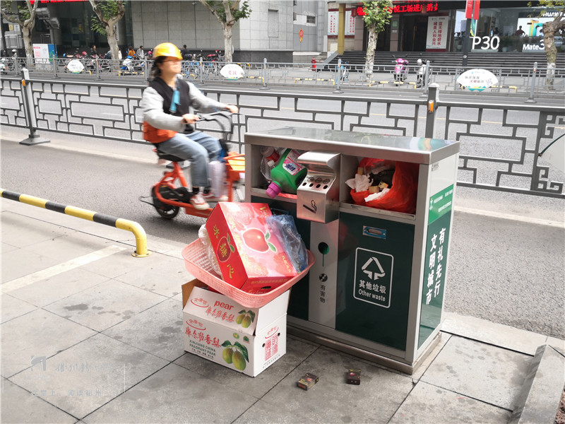 在臨近蛟池街口,人行道上一果殼箱邊散落著一些生活垃圾,遠遠看去顯得特別醒目。走近一看,該果殼箱已被各類垃圾塞得滿滿當當。