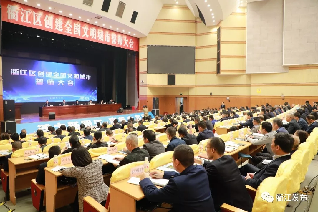 衢江區創建全國文明城市誓師大會召開。區委書記周向軍講話。區委副書記、區長朱素芳部署工作。耿建新、趙建新等區四套班子領導參加。區委常委、宣傳部長吳德生主持會議。