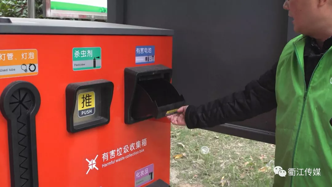 亭內有5個智能垃圾回收箱,其中4個藍色垃圾箱用于投放,塑料、金屬、紙張、玻璃等相應的可回收垃圾。而紅色垃圾箱則有多個投放口,用于投放廢舊燈泡、殺蟲劑、長燈管、廢電池、過期化妝品、過期藥品等有毒有害垃圾。
