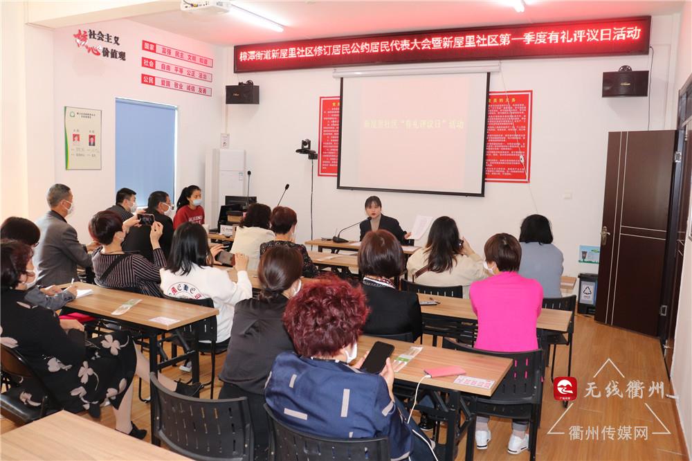 新屋里社區線上通過微信群發送居民公約修訂意見征求通知,線下組織召開修訂居民公約居民代表大會暨第一季度“有禮評議日”活動,結合實際將使用公筷公勺、行作揖禮、不隨地吐痰等有禮做法寫入最新版居民公約。