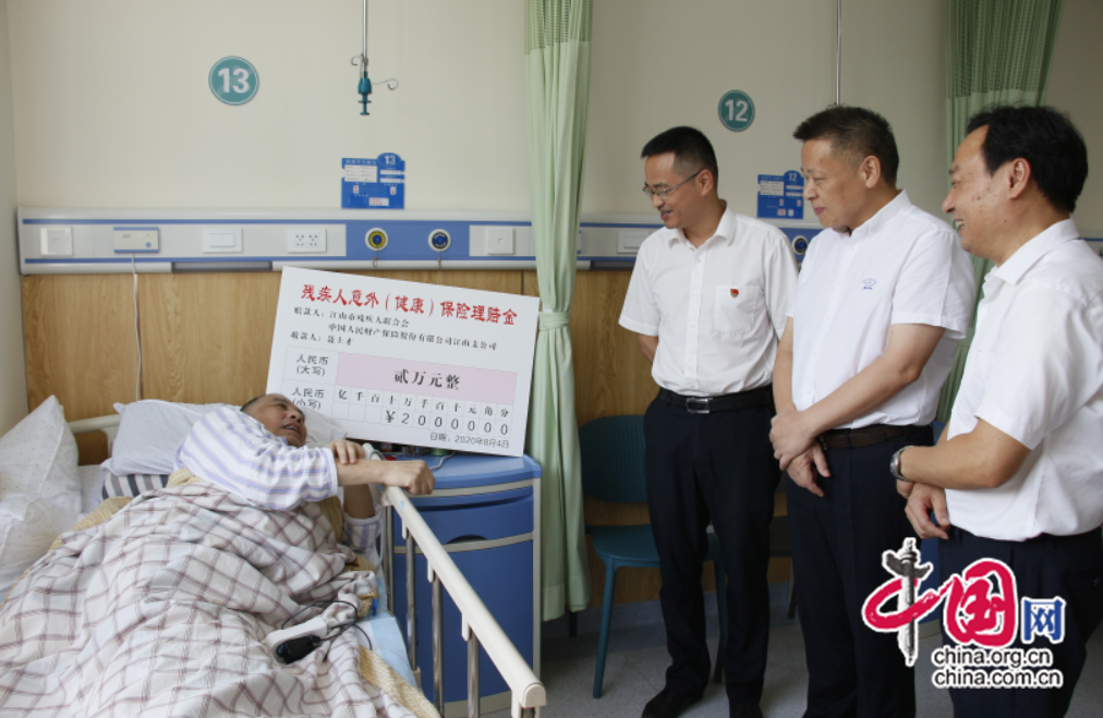 8月6日上午,江山市副市長張志軍來到虎山街道狀元里護理院,走訪慰問因病致困殘疾人聶土才,并為他送上慰問金和祝福。江山市殘聯黨組書記、理事長姜勵,副理事長周文凱,人保財險江山支公司總經理羅富浩、副總經理姜國祥參加慰問。