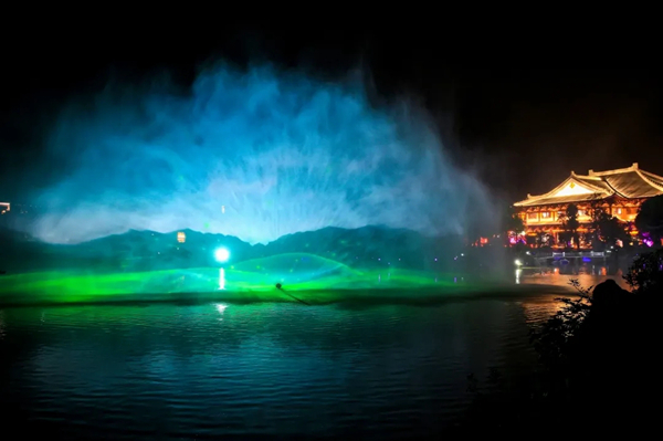 除此之外,在古戲臺、童趣園、歷史文化長河沿岸及小徑上,總有幾組或活潑、或可愛、或古韻悠然的燈組散發出五色光,映襯著湖面上光與霧織就的3D七色光。輝映著暖暖燈光的飛檐斗拱,舞臺上精彩絕倫表演,把整個根宮夜宴推向高潮。