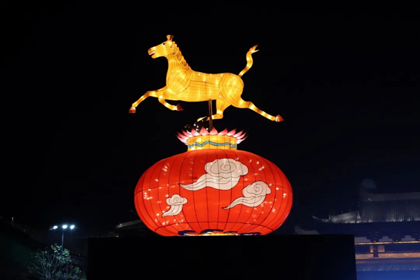 本次迎春大型組燈氣勢恢弘,形式多樣。北大門入口的“馬踏飛燕”,以飛騰之勢迎接四方來客。