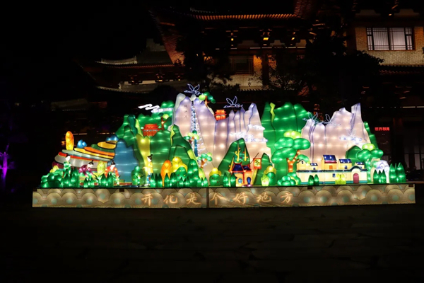 順著郁金香一路延伸的點點星火,華夏文化根雕藝術博物館廣場上的龍鳳呈祥、盛世太平兩組組燈,以磅礴之勢向我們撲面而來。
