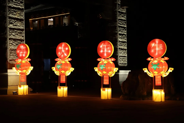 一路前行,醉根廣場入口,一排以傳統元素“牛年大吉”“恭賀新春”的宮燈,流光溢彩。