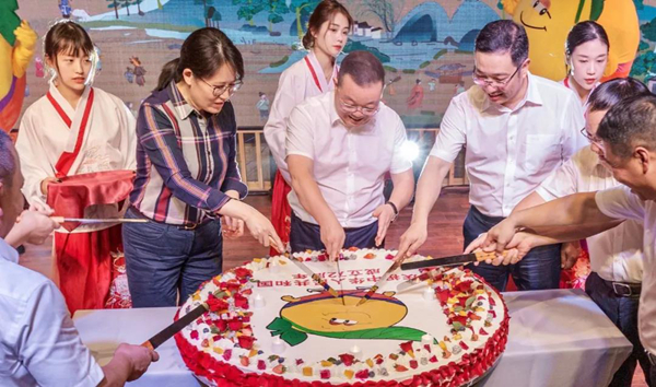 “我宣布,‘宋韻芳村?油茶原鄉’芳村鎮未來鄉村文化市集開市!”晚上8時許,潘曉輝宣布開市,現場霎時響起了陣陣掌聲。與此同時,常山城市卡通形象“胡柚娃”推著72寸的大蛋糕走上舞臺,與會嘉賓在《我和我的祖國》嘹亮的音樂聲中切開蛋糕,和現場群眾共同向祖國母親72歲生日獻禮,將整場活動氣氛推向了高潮。