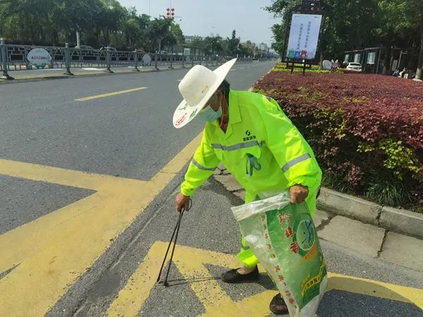 在烈日下,保潔人員胡松英正戴著草帽,拿著一個火鉗和尿素袋四處查看著,時不時停下腳步撿起一張小紙屑或小包裝袋。胡松英負責的是衢州一中校門口這片區域,為了確保環境衛生,她早上6點就已經到達校門口。先是全部清掃一遍,再拿著尿素袋和火鉗四處檢查?!鞍凑胀晡覀冊诟呖紩r候都會晚些下班,今年應該也是。我把邊上掃干凈點,家長和學生看了心情也好些?!焙捎⒄f。