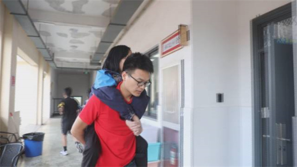 周夢婷的候考室和考場都在教學樓五樓,教學樓沒有電梯,輪椅上不去,等周夢婷到了教學樓,潘立耀便一步跨至輪椅前,彎下腰,雙手曲伸到后面將周夢婷拉在背上,穩穩地背起她走上樓。一路上,潘立耀還鼓勵周夢婷,要以積極的心態面對考試。