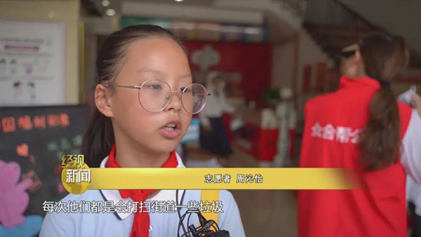 志愿者周沁怡說,每次他們都是會打掃街道一些垃圾,我覺得他們特別辛苦,送環衛工人一些清涼的東西,感覺很開心,做了一件好事。
