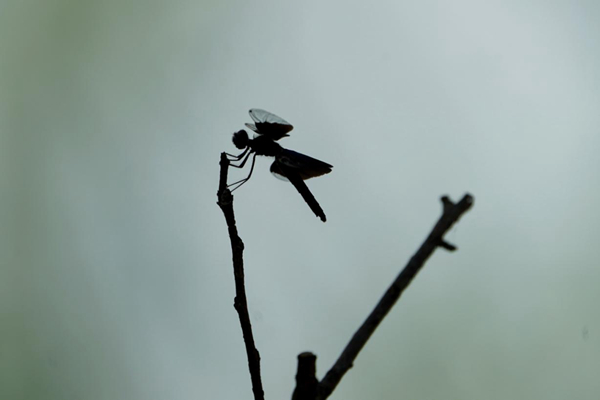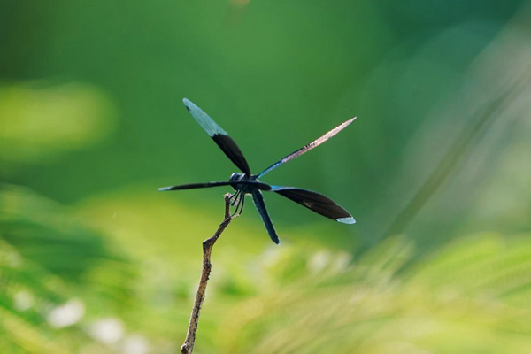 7月26日,筆者在浙江省龍游縣湖鎮鎮省級美麗河湖白鴿湖畔,發現一只黑麗翅蜻停在一根枯枝上,逆著陽光望去,宛如一只帶著翅膀的童話精靈走到了現實中。