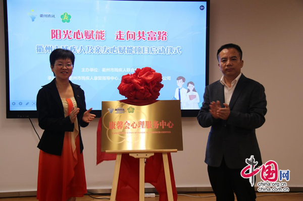 10月9日上午,衢州市殘疾人及親友心賦能項目啟動。啟動儀式上,市殘聯黨組書記、理事長姜忠軍,黨組成員、副理事長徐曉玲為衢州市“康馨會”心理服務中心進行揭牌。