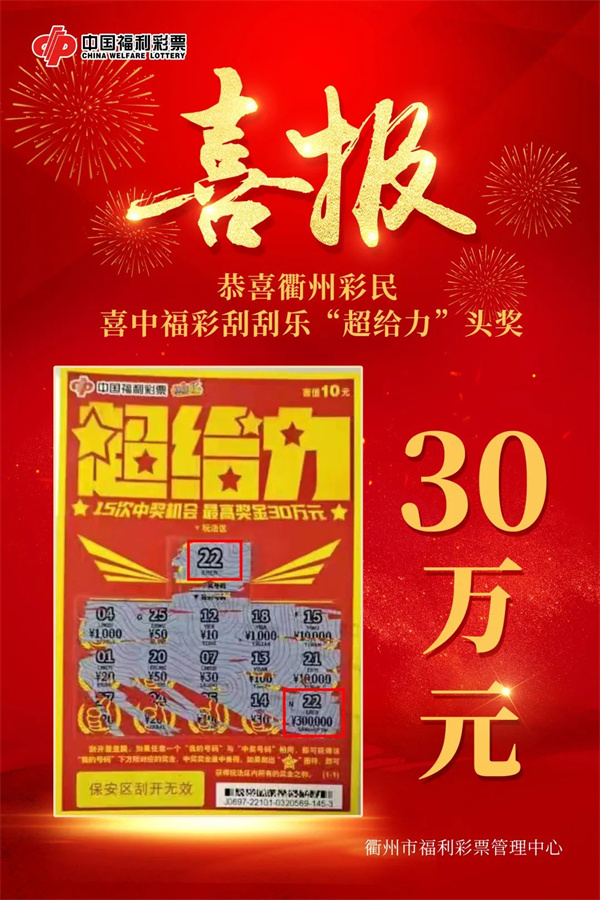 2023年3月18日,衢州市柯城區33085033號福彩銷售站點傳來喜訊,一彩民喜中刮刮樂“超給力”一等獎30萬元。