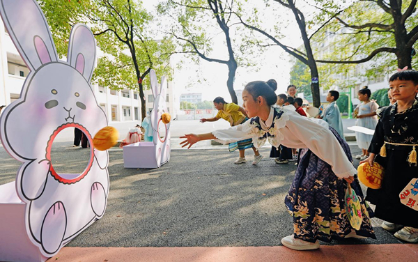 “玉兔吃月餅”看誰吃得最多。在投擲游戲中,“小毛蟲們”或歡笑,或惋惜,充分感受著節日的氛圍以及游戲的樂趣。