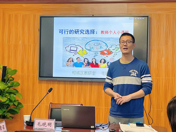 柯城區教研室教科研專家毛曉明老師的講座題為《可行的研究選擇——教師個人小課題》。他以《老木匠的故事》引入,啟發大家領悟每個人都是在為自己做事,鼓勵教師將小事做專,細事做實,實事做透。同時,他以衢州市立項課題為例,指導教師該如何撰寫研究課題。