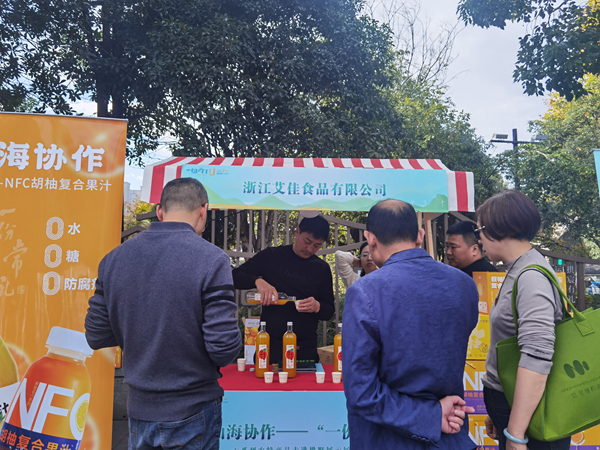 在浙江艾佳食品有限公司的展位前,圍滿了前來品嘗NFC胡柚復合果汁的市民?!熬透杏X回味有點苦苦的,但是沒有添加劑的味道,就很淳樸的味道,買點嘗一嘗?!惫笆麉^上塘街道企業代表彭女士說道。短短兩小時內,就銷售了5712元。