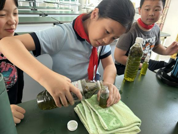 孩子們自己親自采摘的薄荷葉、艾草和金銀花,經過清洗、晾曬、挑選、按比例混合后加入酒精靜置,最后稀釋成花露水。