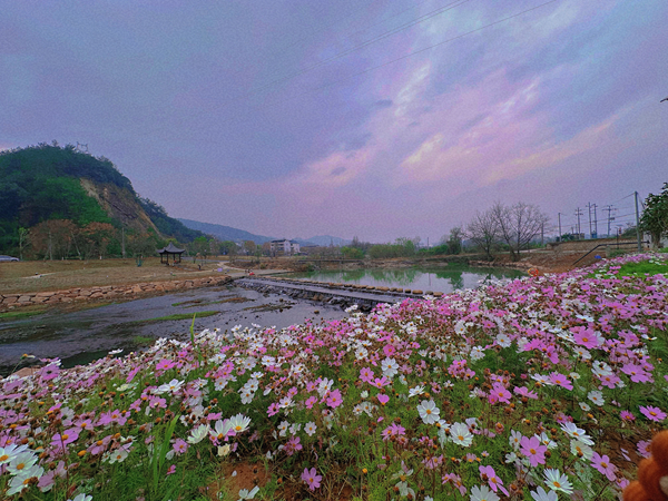 沿著溪邊綠道漫步,清澈的溪水、蜿蜒的綠道和五彩斑斕的花朵,構成一道靚麗風景線。最引人注目的,莫過于盛開的格?;?。一片片、一簇簇,深淺層疊、色彩繽紛,好似一幅五彩斑斕的畫卷。每一朵格?;ǘ枷窬牡窨痰乃囆g品,它們有著八片帶有小齒的花瓣、中間是黃色的花蕊……一陣微風吹過,格?;〒u曳身軀,激起花?!扒永恕??;êig少量蜂蝶翻舞,為蕭瑟冬日增添一抹生機。