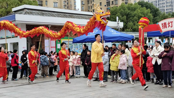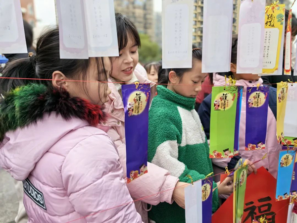 第五篇章,樂猜燈謎。一條條精選的謎語懸掛在大紅燈籠上,謎面有趣而通俗,內容包含中華傳統詩詞文化、歷史人文、天文地理、科學知識等方面的知識,或仰頭讀題,或低頭深思,或與同學共同探討謎底,玩得不亦樂乎。