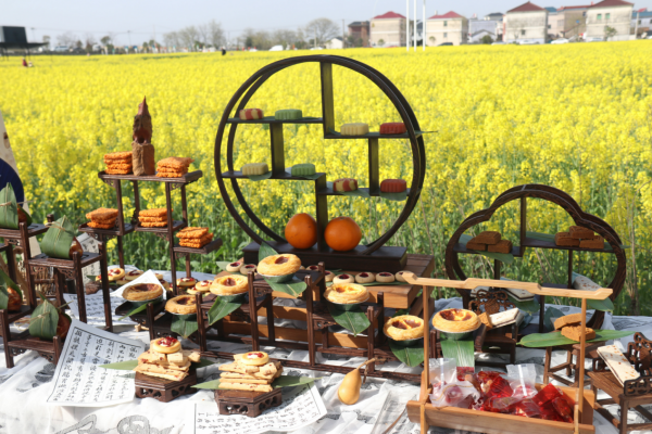 除了現場精彩的歌舞表演,一旁的鄉村市集也熱鬧開市,創意扎染、剪紙工藝、陶藝、雕刻等非遺手工作品,還有衢州本地特色美食等攤位吸引了游客駐足挑選。鄉村市集涵蓋助農惠農、美食共享、手工體驗的多個品種,在風景秀麗的油菜花田,通過集市載體激活旅游富村內生動力,擦亮鄉村振興共富底色。