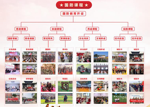國防教育課程化“一課四隊”包括英雄模范教育課、國旗護衛隊、射擊隊、拳術隊、特戰隊。學校全面系統的開展以“一課四隊”為主要內容的國防教育課,其中包括思政課程、體能課程、養成課程、實踐課程,打牢學生的國防理念,培養學生軍事素質,筑牢愛國主義觀念,成為德智體全面發展的新時代好少年。