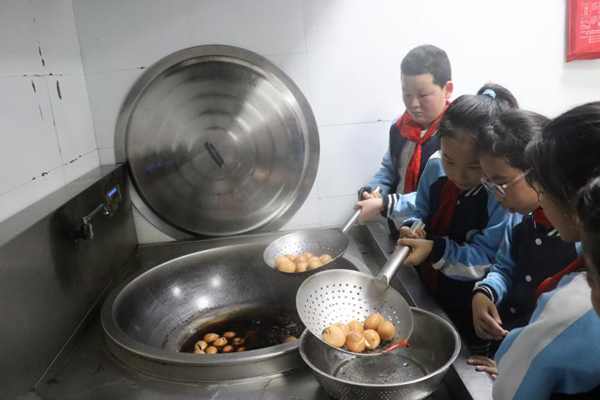 孩子們紛紛拿出自己的壓歲錢,親自挑選最新鮮的雞蛋。在“愛心廚房”里暖流涌動,只見孩子們用自己的小手,小心翼翼地清洗著每個雞蛋,并把洗干凈的雞蛋慢慢放入大鍋中煮熟,最后按照勞動課所學的知識,分步驟加入適量的調料,不一會兒,整個廚房香氣撲鼻。