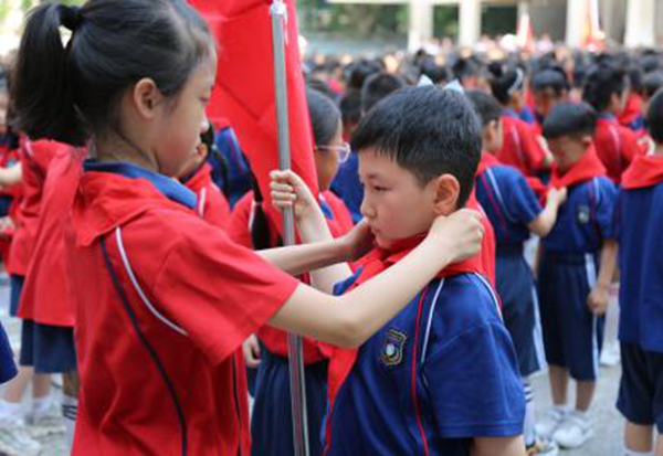 儀式上,大隊輔導員徐芳馨宣布了入隊的新隊員名單。校領導們為新中隊授予了中隊旗,聘任13位優秀教師為新中隊的輔導員。二年級的老隊員們鄭重地為新隊員佩戴了鮮艷的紅領巾。在鮮艷的隊旗下,在嘹亮的隊歌中,新隊員們敬著標準的隊禮,成為了光榮的少先隊員!“紅領巾”的夢想從此起航。