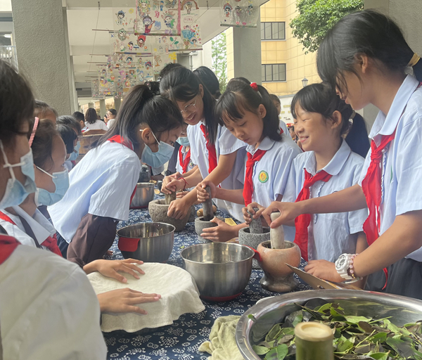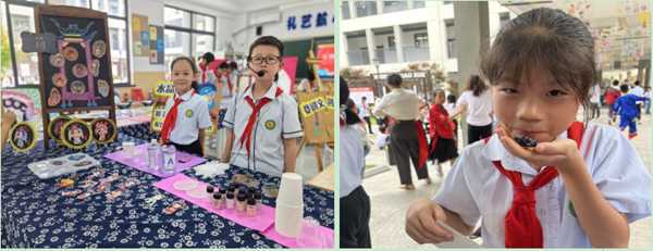 瞧,成果講解區和項目介紹區的航小學子熱情洋溢,信心十足,在各自的舞臺上展現別樣的自己。做烏米飯、跳竹竿舞、聆聽音樂會、探婺劇之秘……孩子們們則通過聆聽講解與沉浸式體驗的方式,共享課程成果?!拔移穱L了烏米飯,還跳了竹竿舞,了解了畬族的文化,真是太有意思了!”五1班陳若冰同學開心地說。
