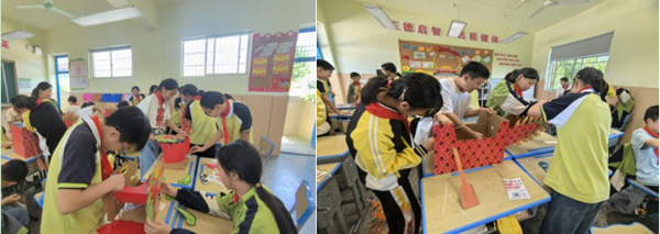四年級的學生們則學習了竹編技藝,并制作了竹編掛件。在老師們的耐心指導下,孩子們掌握了竹編的基本技巧,將一根根竹子編織成了各種形狀和圖案的掛件。這些掛件不僅美觀實用,還讓孩子們感受到了傳統文化的獨特魅力。