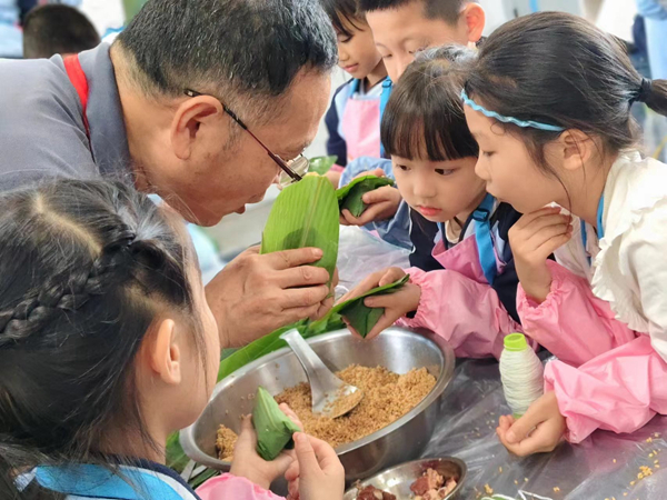 下午點心時間,食堂阿姨送來了煮好的粽子。學生們手拿粽子,品嘗著自己的杰作,幸福之情溢于言表。