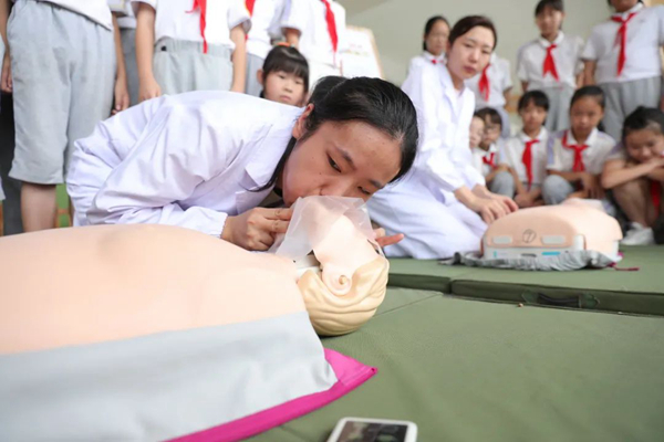 縣人民醫院宣講團隊為同學們送來“心肺復蘇急救知識大禮包”。醫生們通過人體模型演示了正確的心肺復蘇操作步驟,讓同學們更加清晰了解進行心肺復蘇時在胸外按壓急救法的位置、頻率、深度及動作。在互動環節中,醫生重點講解心肺復蘇的誤區及注意事項,提醒隊員們要熟記規范動作及操作步驟,妥善處理突發情況,并進行了實踐操作。