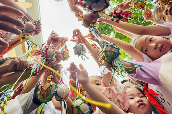 端午編蛋袋源于上古時期的神話故事,古人認為用它們裝著雞蛋掛在孩子身上,可以保佑孩子健康、平安。孩子們用自己的雙手,將小小彩繩,編織成一個個蛋兜,既是勞動成果,也是美好祝愿。之后,就要看大家在體育測評中如何保護好自己的蛋袋和雞蛋了哦!